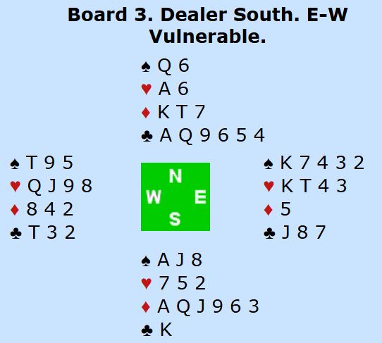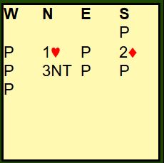 Med alle i sonen og syd som giver åpnet syd med 1 hjerter før vest hoppet inn med 2 spar (svakt innhopp). Nord meldte 3 spar som var definert som en god 4 hjertermelding. Det endte i 6 hjerter. Omtrent sånn gikk meldingene ved mange bord. Mange par kom altså i 6 hjerter, men spilleføringen gikk på ingen måte likt rundt omkring i salen.
