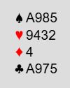 Utspillet vinnes. Så en runde trumf fulgt av at spar 7 trumfes. Så tas for ruter konge og ruter til esset. Nå kommer det vakre sluttspillet, spar knekt spilles med avkast syds ruter 7 idet dette er de gjenværende kortene: