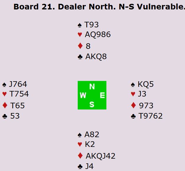 Vest var spillefører i 6NT og fikk hjerter knekt ut ved de fleste bordene. Det er seks sikre stikk i majorfargene, to ruterstikk og to kløverstikk = 10. Men flere muligheter for ekstra stikk. Om hjerteren sitter 3-3 er det elleve stikk, og om sparen også sitter fordelt 3-3 eller en av dem har J-10 dobbel i spar er det tretten enkle. Men hva om ingen av de fargene gir ekstra stikk?