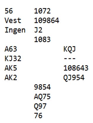 Det er vel nesten umulig å se for vest siden sparutspillet så bra ut fra hans side av bordet. Så om de bruker Smith signaliserer nok vest positivt i hjerter, positivt om at han likte utspillet. Og spesielt om et sånt signal kommer fra vest er det veldig vanskelig for øst å finne kløverskiftet. Det er sannelig ikke så lett å finne det selv om det ikke kommer noe sånt Smith-signal fra vest. Men kanskje er kløverskiftet mulig å finne?