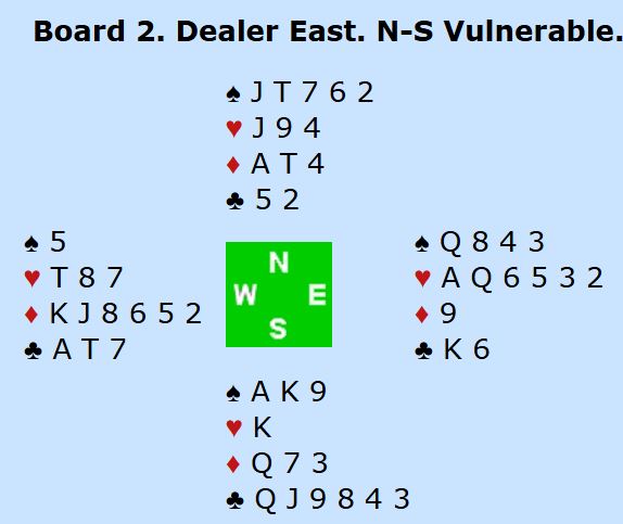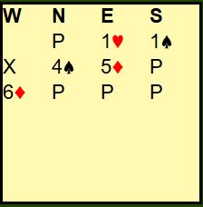 I hjerterkontrakt er det kun en taper i trumf og en i kløver i tillegg til at det blir bare en spartaper, for fra vest kan en spar kastes på ruter konge. Kun ett par var i 4 spar. De vant den etter hjerter ess i utspill som gjorde at N/S ikke fikk kløverstikk, det var inntak til øst for å hente ruter konge og kaste kløver fra vest. Om det spilles ut kløver får ikke spillefører kommet seg over for å tatt det avkastet. Det var en lang rekke +620 i hjerterutganger, og det ga middels. Noen få par fikk fatt i ett overstikk og noterte med det 60%. Ett par fikk 70% for +660 i 3NT, en kontrakt som er håpløs om det kommer kløver ut.