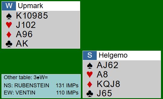 Ved dette bordet stoppet N/S korrekt i 3 spar. N/S ved her er også med på det åpne laget i VM, men hva syd gjorde i starten av spilleføringen er svak bridge.