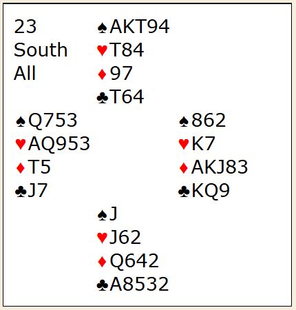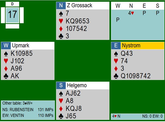 Alt er trist i dette spillet bortsett fra resultatet, +420. Utspillet ved begge bord er dårlig (men alle utspill kan jo være klaff), motspillene veldig svake, og skift til liten hjerter mot slutten er toppen på kransekaka. Øst bør se at han kan bli skviset, og hvis han spiller hjerter bør å spille damen være opplagt. Da holder vest hjerteren, og N/S går fortjent bet i den for hardt meldte utgangen.