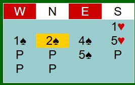 Mot oss åpnet vest med 1 hjerter som for dem viser 8-14 poeng. Nord doblet, og øst sa 3 hjerter, 3 spar fra syd. Nå la nord på til 4 spar, en tvilsom avgjørelse selv om han har et par HP på lager. Syd behøver ikke ha mer enn firekorts spar, og selvsagt ikke kort som gode nok til utgang. Hvis 4 spar skal være bra her må syd ha gode nok til å melde det selv.