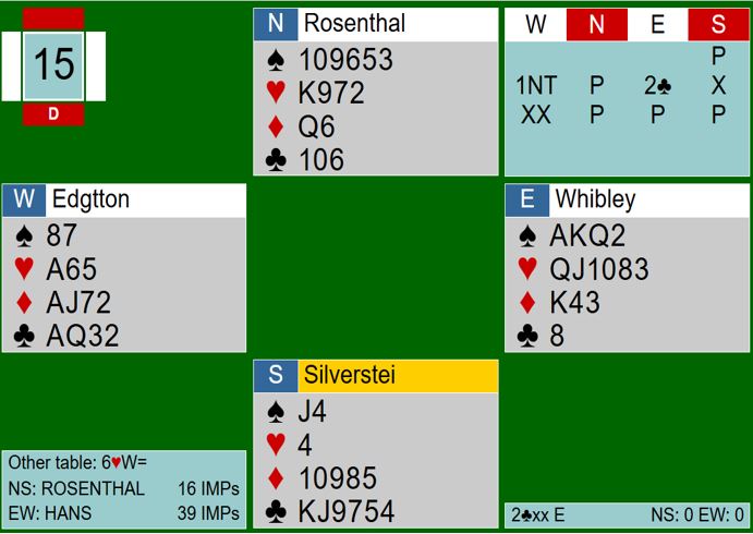 På de seksten spillene ble det gjort grove feil på minst 9 av dem, noen ganger feil ved begge bord. Her er et spill hvor vi satt ved det andre bordet enn det du ser her, mot et par som skal spille Bermuda Bowl i Danmark. Det som skjedde bør grunn for seriøs bekymring.