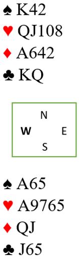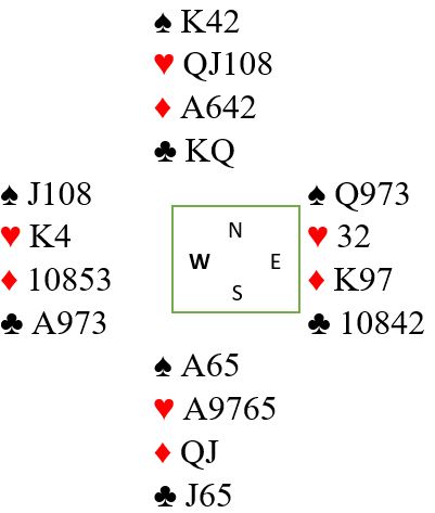Trumfen kan ikke tas ut med det samme, da tar Ø/V tre ruterstikk idet de kommer inn i hjerter. Så allerede i andre stikk spilles liten hjerter fra hver hånd!
