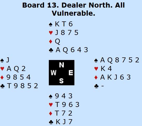 Den svenske nord la ned trumfesset. Men «safevarianten» i hjerter var ikke en safevariant i denne kontrakten idet det viste seg at det var to spartapere og en kløvertaper som sammen med den ene trumtaperen som kunne vært unngått ga en bet, Danmark +100.
