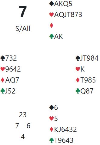 Joda, jeg sa utspillet er umulig finne i praksis. For de eneste som beter 7 hjerter er å spille ut den single trumfkongen! Uten det utspillet er det bare en måte å spille kontrakten: Nords spar5 trumfes med syds single trumf. Da går det jo ikke å ta trumffinesse lenger, så en spiller seg over til nord og legger ned trumfesset uten særlig forhåpninger. Men booom...kongen faller - tretten stikk! Bare å tenke på det utspillet - singel trumfkonge mot storelem - er egentlig ganske sykt.