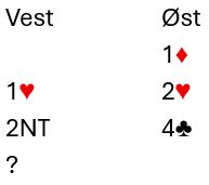 Her viser øst sitt hopp til 4 kløver firekorts trumf og singel kløver. Nå vet vest at de skal til 6 eller 7 hjerter og kan like godt spørre med det samme om nøkkelkortene (essene, trumf kongen og trumf damen), helst med 4 spar som Exclusion Key Card Blackwood siden spar ess antagelig ikke er så interessant. Det mangler ikke nøkkelkort, men trumfdamen mangler. Det kan vel likevel være fristende å satse på 7 hjerter som mest sansynlig avhenger kun av at trumfen ikke gir taper?
