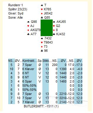 Tommy i Syd som nå har en makshand (14 hfp) valgte nå å melde denne som en minimumshand og meldte 3 spar . Etter systemet kunne han ha meldt 3 ruter, som viser tillegg og interesse for 4 spar med maks hos makker, men siden det ikke blir gjort har makker en obligatorisk pass. Denne gangen ble det skjebnesvangert. Videre meldingsforløp gikk dermed pass, pass og 4 kløver hos Gunnar Ødegård. 4 spar fra Tommy var selvfølgelig for sent nå, og Torbjørn Amdam hadde ingen problemer med å melde stampen 5 kløver.